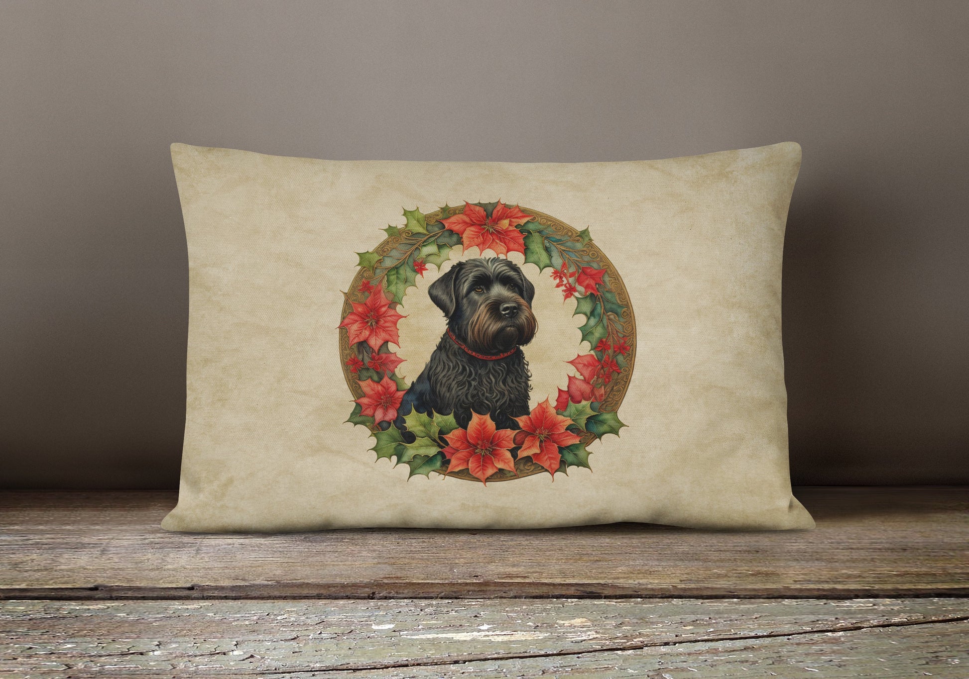 Սև ռուսական տերիեր Սուրբ Ծննդյան ծաղիկներով բարձ