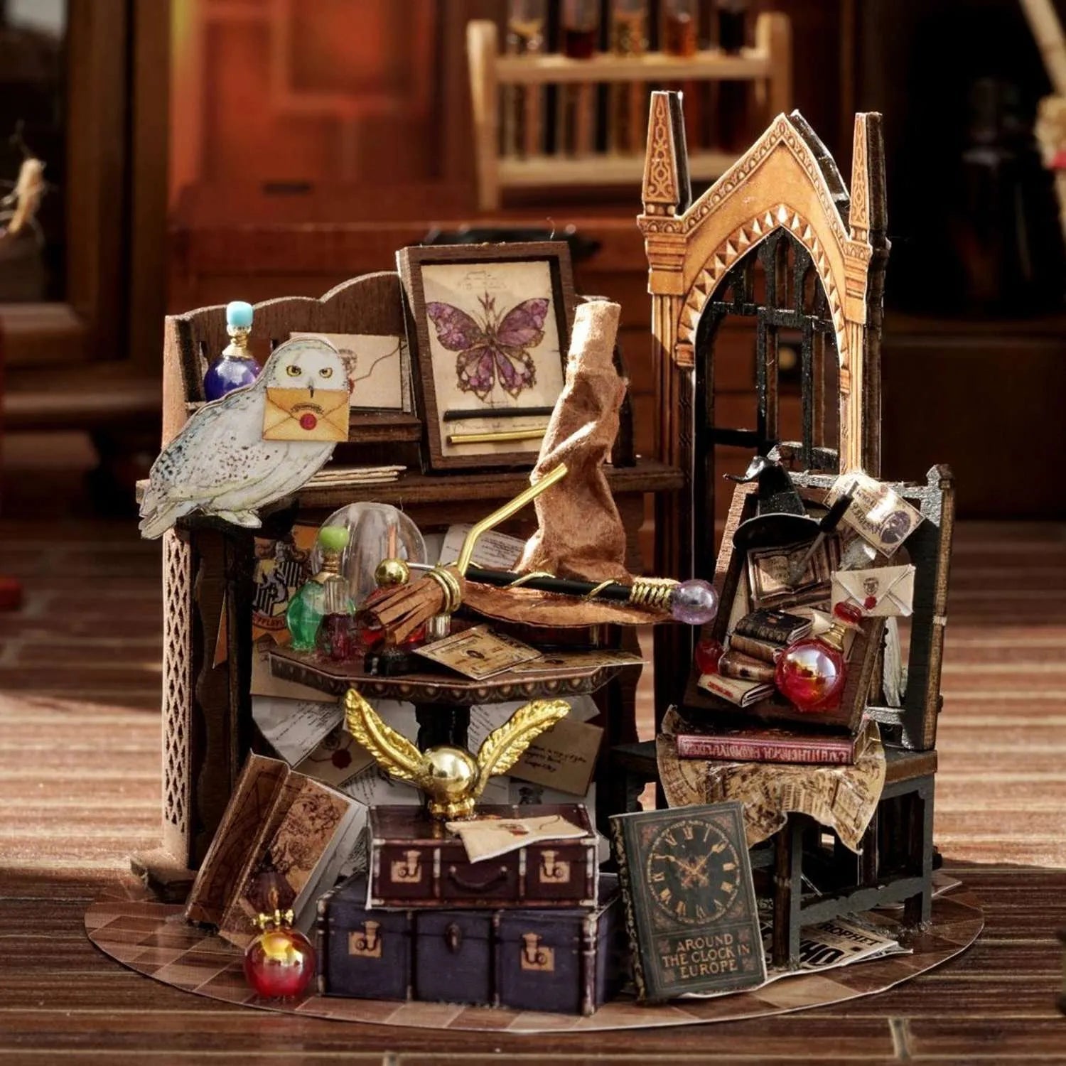 Այս մանրանկարչական սենյակային արկղը ներկայացնում է կախարդի աշխատասենյակից ոգեշնչված հմայիչ տեսարան, իսկ վերևում պատկերված է մանրանկարչական գնացքի կայարան։ Ներսում դուք կգտնեք մանրակրկիտ մշակված տարրեր, ինչպիսիք են՝ դեղամիջոցների շշերը, կախարդական գրքերը, բուը՝ տառով, և այլ հմայիչ աքսեսուարներ, որոնք արտացոլում են կախարդական աշխարհի էությունը։ Հիանալի է սիրողականների և հավաքորդների համար, այս սենյակային արկղը առաջարկում է ժամերով ստեղծագործական հաճույք, քանի որ դուք կենդանություն եք հաղորդում յուրաքանչյուր փոքրիկ կտորին։