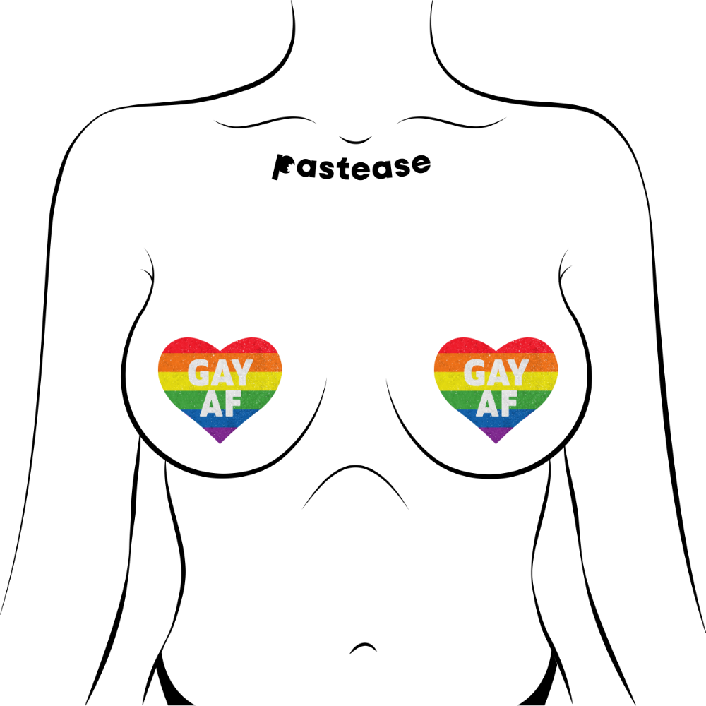 YYY5:-Pack: Love: Rainbow 'GAY AF' on Glitter Velvet Heart Nipple Pasties by Pastease®YYY