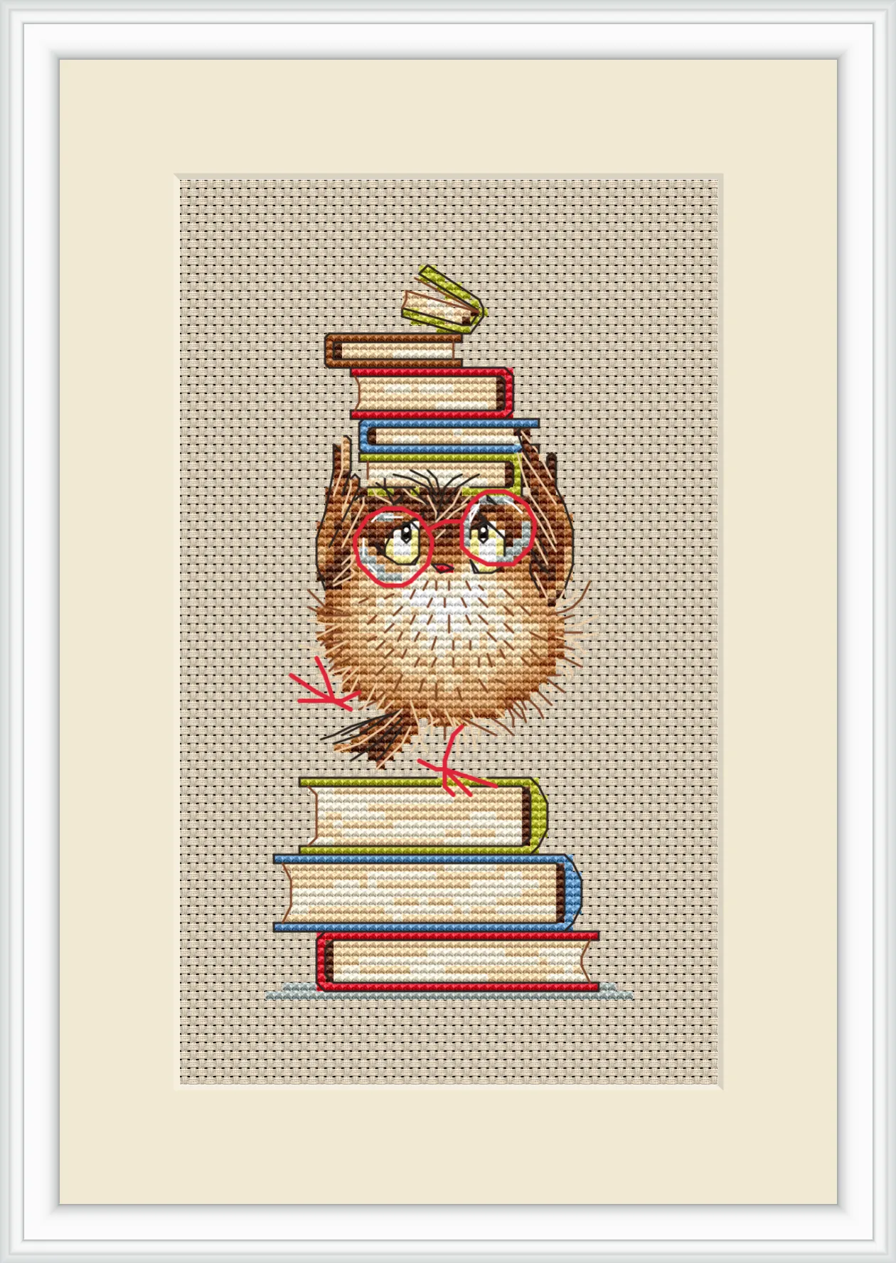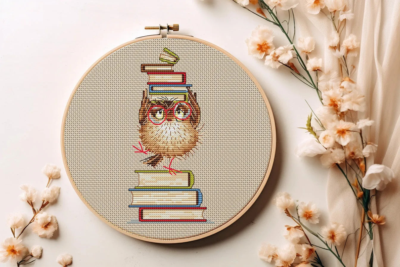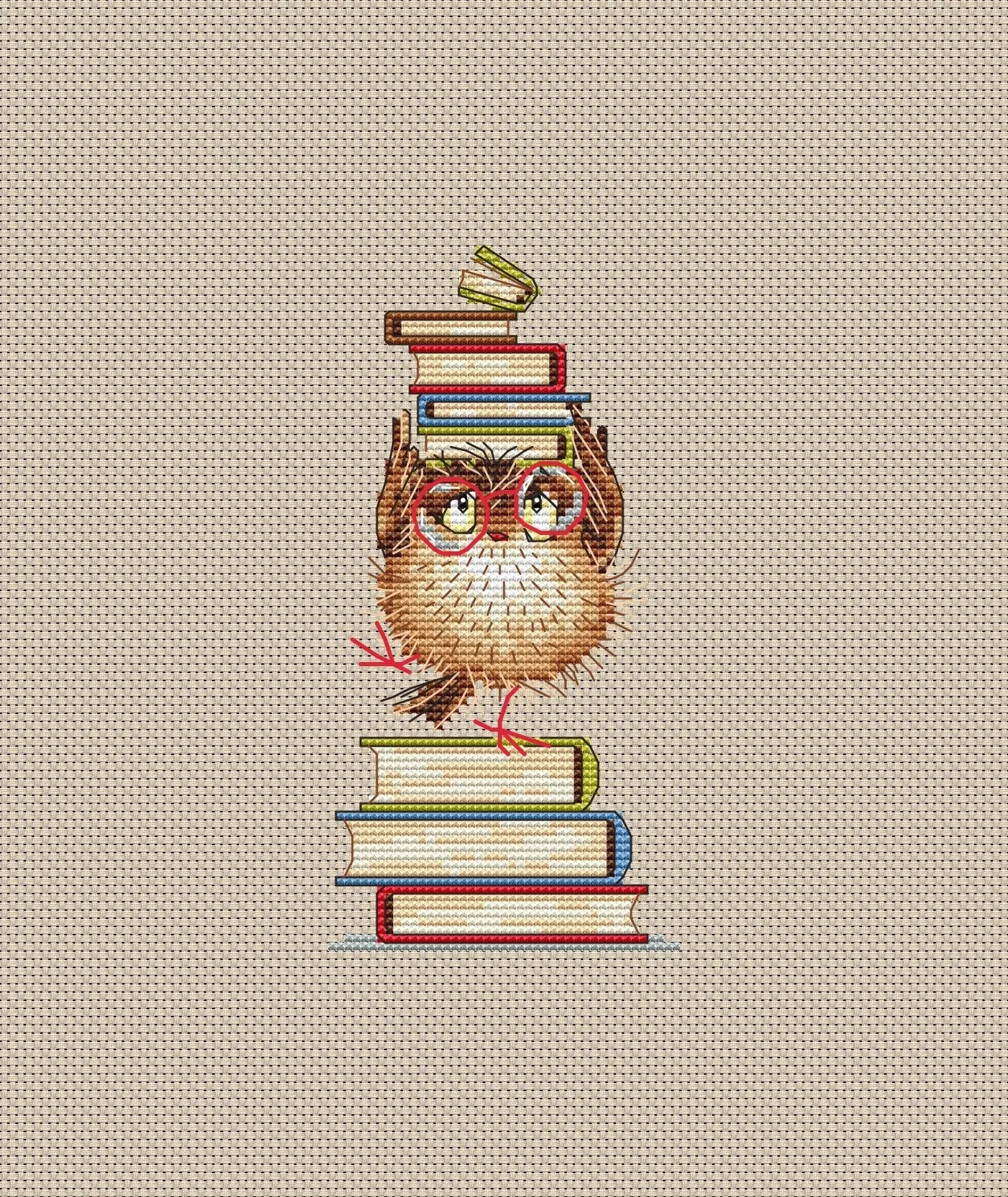 Create your own adorable cross-stitch masterpiece with our instant download PDF featuring a wise owl in glasses surrounded by books, perfect for any bookworm enthusiast. This charming embroidery chart depicts a cute little bird engrossed in a pile of books, making it an ideal project for those who adore both birds and literature. Stitch your way to wisdom and cuteness with this delightful owl-themed pattern, a must-have for any avid crafter's collection.