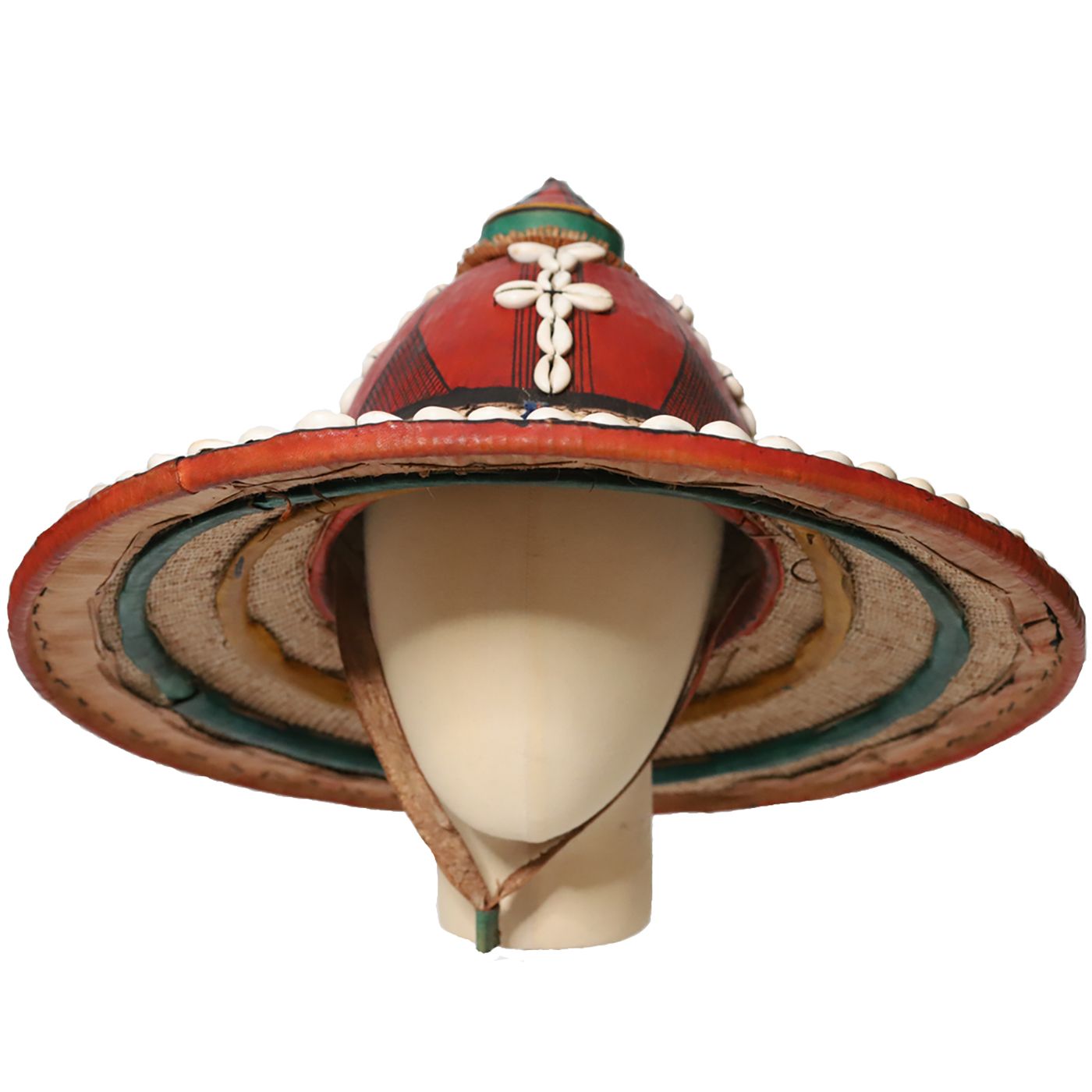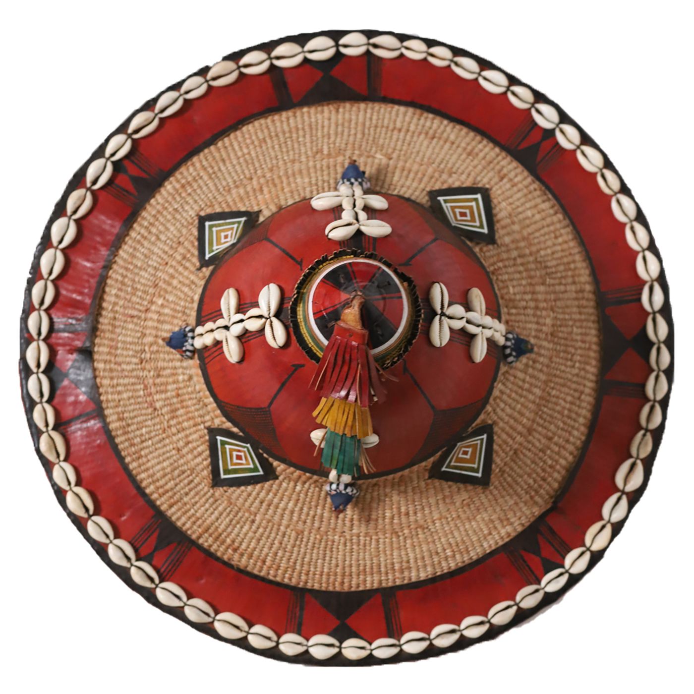 Our Fulani hat is made out of an organic plant fiber with leather applications and Cowrie shells.  At the base of the hat there is a chinstrap with a tassel at the end.  Handmade by Fulani artisans in Mali.  No two are the same due to the nature of handmade.  This is also a great wall decor!