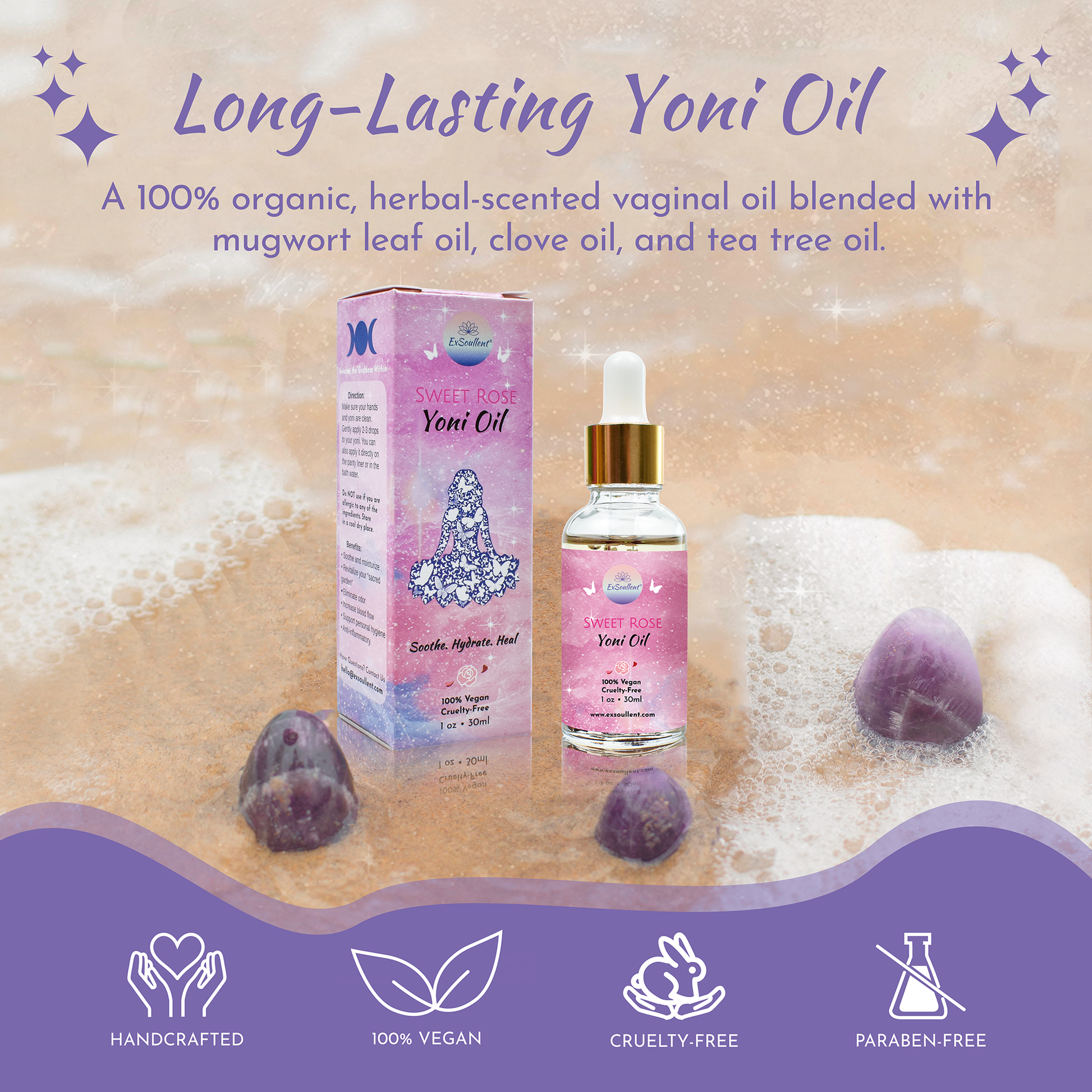 🌸LUXE ROSE YONI OIL: A 100% organic herbal-scented vaginal oil blended with mugwort leaf oil, clove oil, and tea tree oil. Our powerful blend is rich in antioxidants and provides effective relief from dryness, itchiness, and odor while maintaining ph levels, rejuvenating, and moisturizing your skin.