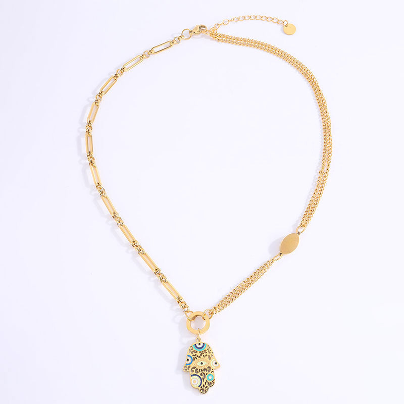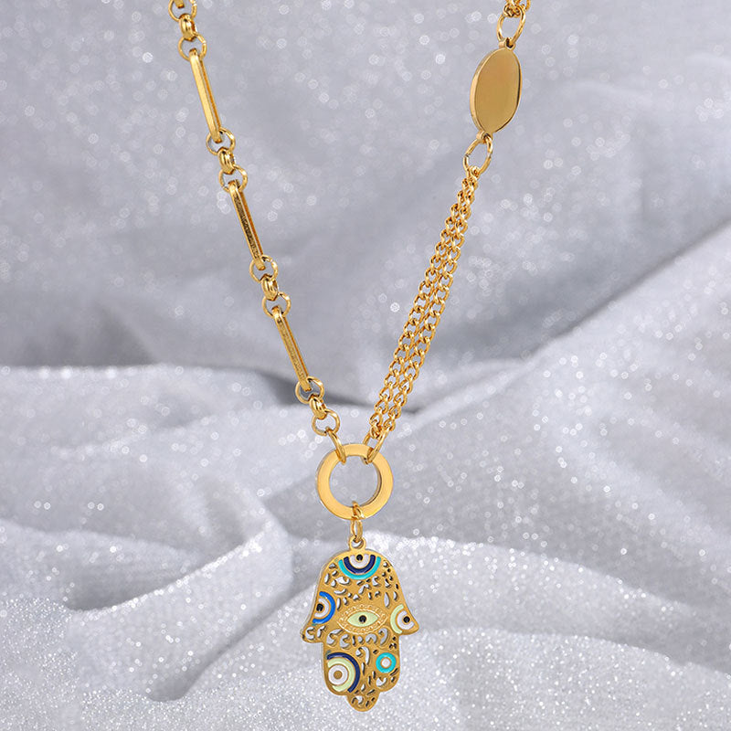 This elegant and modern necklace showcases an intricately designed Hamsa pendant with vibrant enamel accents, symbolizing protection and positivity. The dual-chain design, featuring a mix of cable and elongated link chains, adds a stylish and contemporary touch, making it a versatile accessory for any occasion.