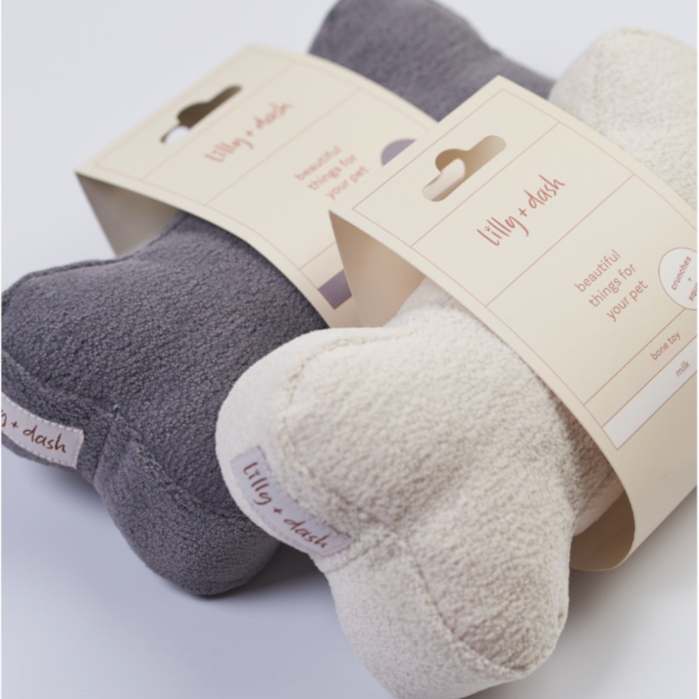 Our soft and stylish charcoal coloured boucle bone toy is both aesthetic and fun. It squeaks and crunches for never ending chewing entertainment. Available in two neutral shades, our bone toy will suit any modern space. Complete your Lilly + Dash boucle collection with our walking set and chic dog toys.