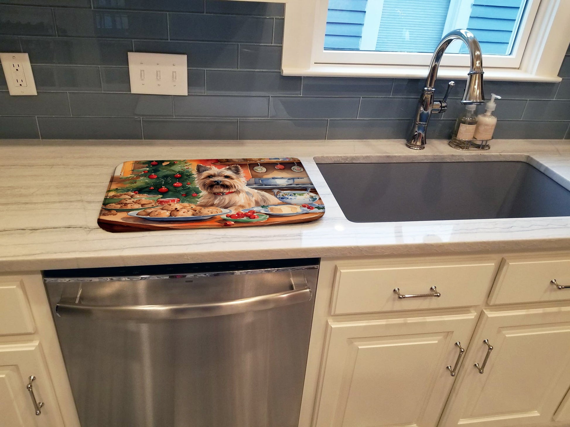Dish Drying Mat featuring breed specific Cairn Terrier artwork. Celebrate Christmas with this Christmas Dish Drying Mat. Say goodbye to messy countertops and soggy dish towels with our innovative dish drying mat. Our high-quality dish drying pad is designed to keep your countertops dry while offering a stylish and efficient solution. Whether you're air drying dishes, glasses, stemware, silverware, pots, pans, bottles, or even fruits and vegetables, our dish mat is the perfect choice. The 14 inches x 22 inches size fits most counters and dish drying racks, and the non-slip design ensures stability. Made with water-absorbent polyester and a polyurethane foam insert, our dish drying mat is not only functional but also durable. It's machine washable and printed in the USA for long-lasting use. The beautiful artwork adds flair to your kitchen decor, making it a perfect housewarming gift or present for any occasion. Upgrade your kitchen experience with our absorbent and versatile dish drying mat.