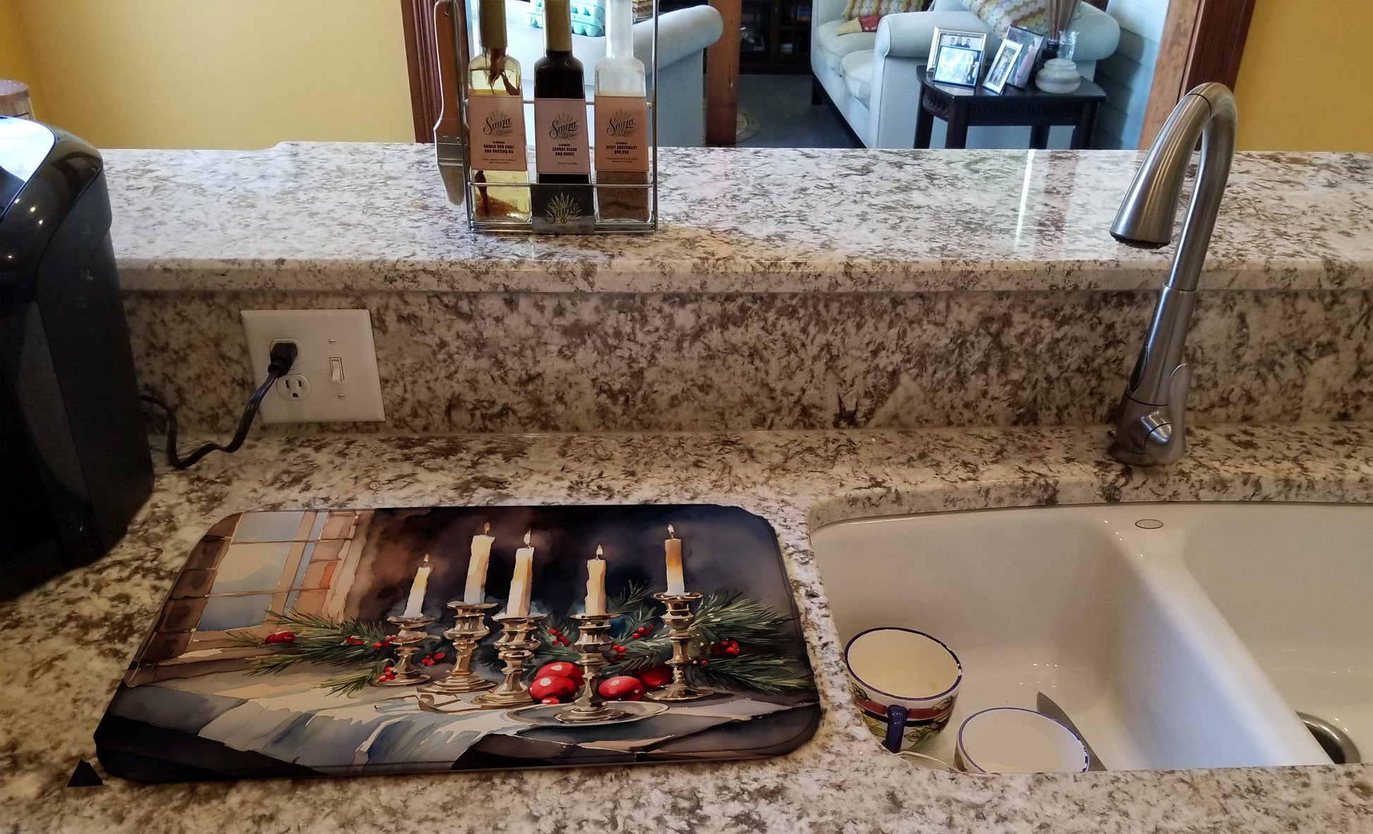 Celebrate Christmas with this Christmas Dish Drying Mat. Say goodbye to messy countertops and soggy dish towels with our innovative dish drying mat. Our high-quality dish drying pad is designed to keep your countertops dry while offering a stylish and efficient solution. Whether you're air drying dishes, glasses, stemware, silverware, pots, pans, bottles, or even fruits and vegetables, our dish mat is the perfect choice. The 14 inches x 22 inches size fits most counters and dish drying racks, and the non-slip design ensures stability. Made with water-absorbent polyester and a polyurethane foam insert, our dish drying mat is not only functional but also durable. It's machine washable and printed in the USA for long-lasting use. The beautiful artwork adds flair to your kitchen decor, making it a perfect housewarming gift or present for any occasion. Upgrade your kitchen experience with our absorbent and versatile dish drying mat.