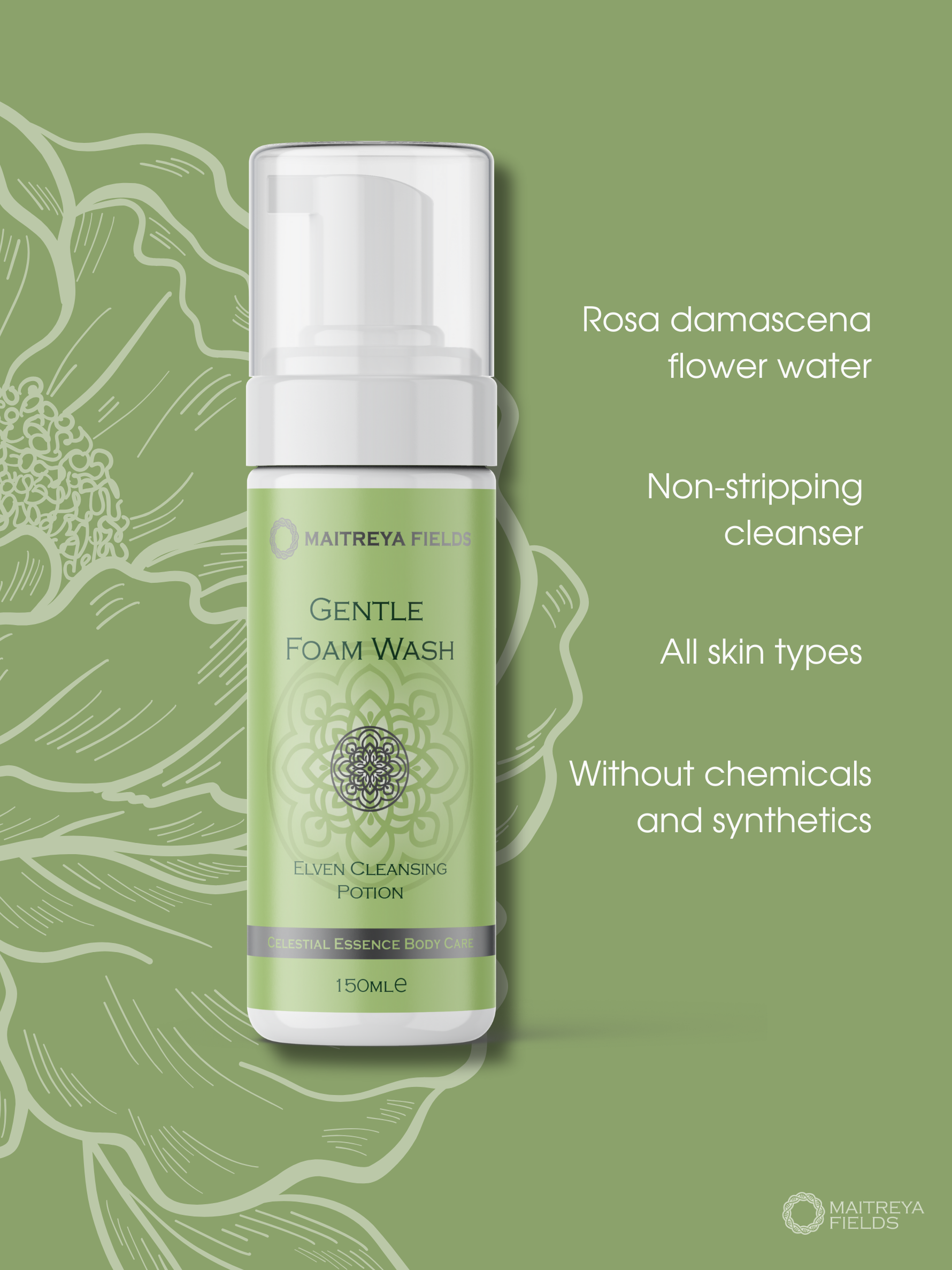 Introducing Gentle Foam Wash - Elven Cleansing Potion, a luxurious facial cleanser designed to refresh and purify your skin with the elegance of nature. Featuring organic Rosa Damascena Flower Water, renowned for its soothing and hydrating properties, it gently removes impurities, leaving the skin soft, refreshed, and beautifully radiant.