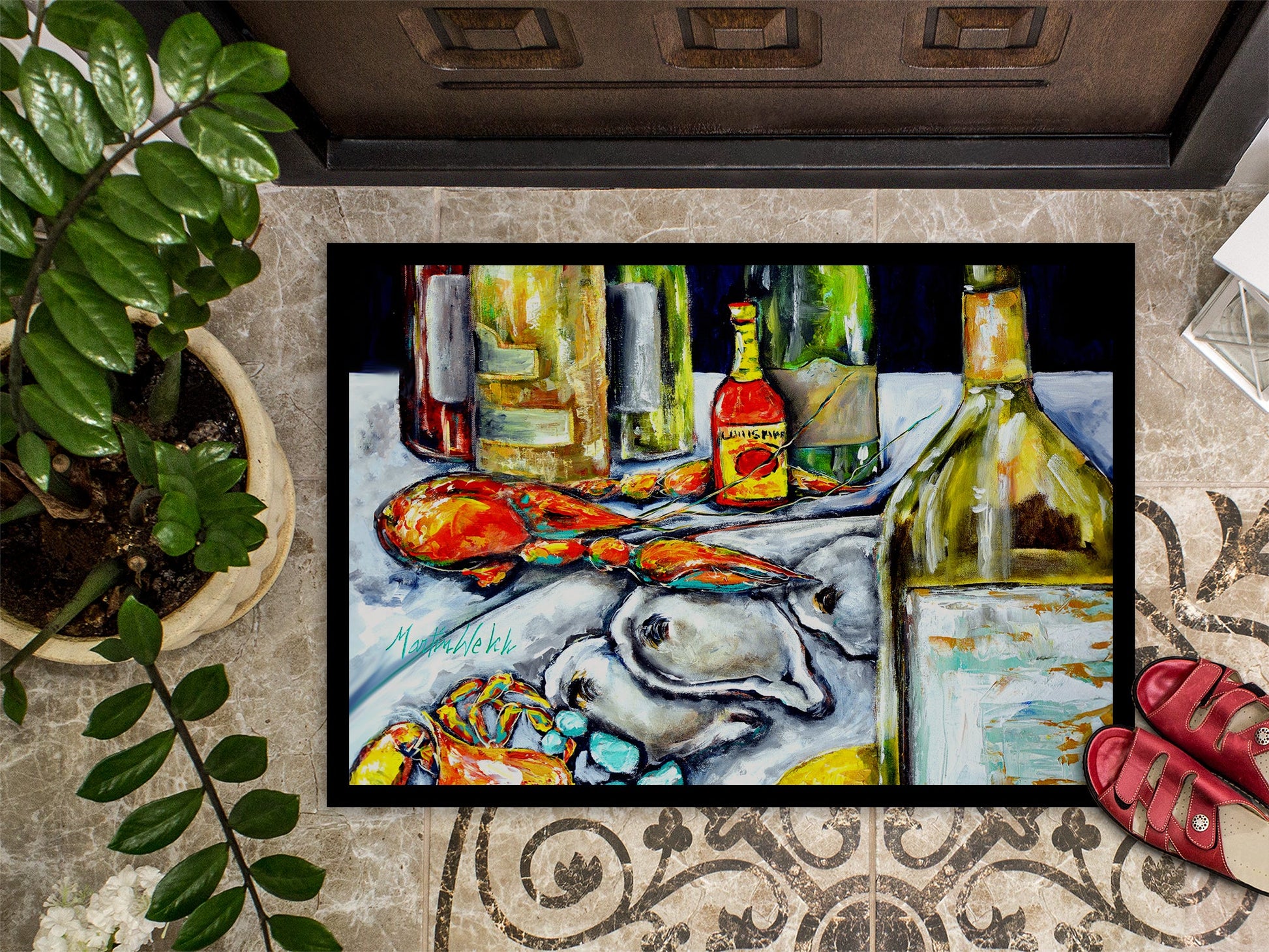 Welcome your guests in style with our Artwork Door Mat, designed to withstand almost any weather condition. This mat, measuring approximately 18 by 27 inches, is held together by durable black binding tape. Its top layer, composed of polyester felt, is dyed with the eye-catching image you see on the mat. A few layers below provide the mat with stability, while its rubber bottom is stamped to help prevent slipping and ensures safety. Our mat works wonderfully as both an indoor or outdoor door mat. For cleaning, simply hose it off with water or use a power washer - no need for any cleaner that produces suds. Avoid scrubbing with a brush, instead, opt for the vacuum on floor setting. Designed manufactured and printed in the USA, this mat is a perfect addition to your porch, outdoor kitchen, entryway, or any indoor space. Its unique design makes it a charming decorative rug that greets your guests and adds a stylish touch to your home decor.