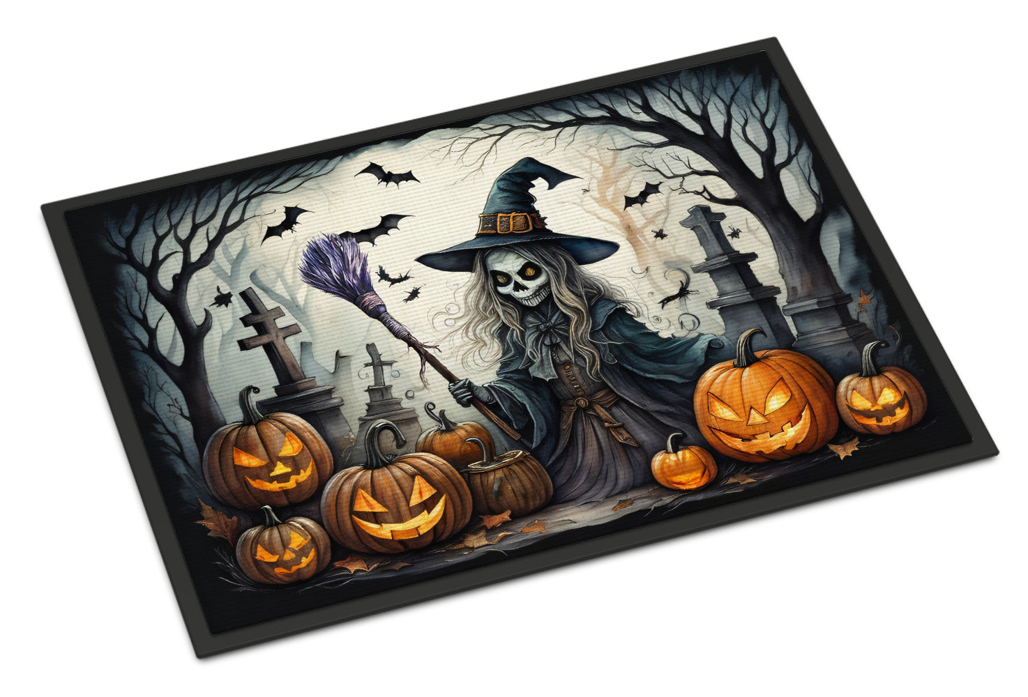 Celebrate Halloween with this Halloween Doormat. Welcome your guests in style with our Artwork Door Mat, designed to withstand almost any weather condition. This mat, measuring approximately 18 by 27 inches, is held together by durable black binding tape. Its top layer, composed of polyester felt, is dyed with the eye-catching image you see on the mat. A few layers below provide the mat with stability, while its rubber bottom is stamped to help prevent slipping and ensures safety. Our mat works wonderfully as both an indoor or outdoor door mat. For cleaning, simply hose it off with water or use a power washer - no need for any cleaner that produces suds. Avoid scrubbing with a brush, instead, opt for the vacuum on floor setting. Designed manufactured and printed in the USA, this mat is a perfect addition to your porch, outdoor kitchen, entryway, or any indoor space. Its unique design makes it a charming decorative rug that greets your guests and adds a stylish touch to your home decor.